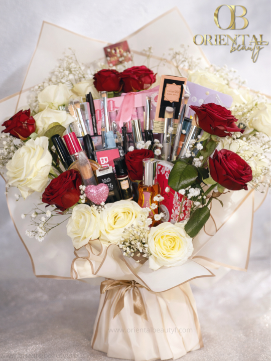 Ce bouquet prestigieux associe des roses fraîches soigneusement sélectionnées à un assortiment de produits de beauté, pour offrir un cadeau unique, élégant et mémorable.